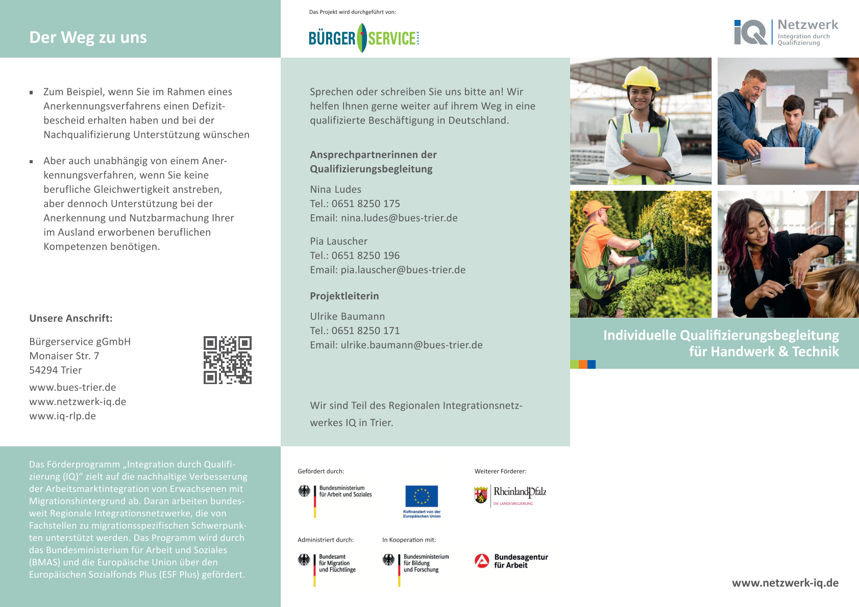 Das Team des BÜS - Bürgerservice Trier gGmbH im Projekt IQ Qualifizierungsbegleitung Handwerk und Technik in Trier ist erreichbar